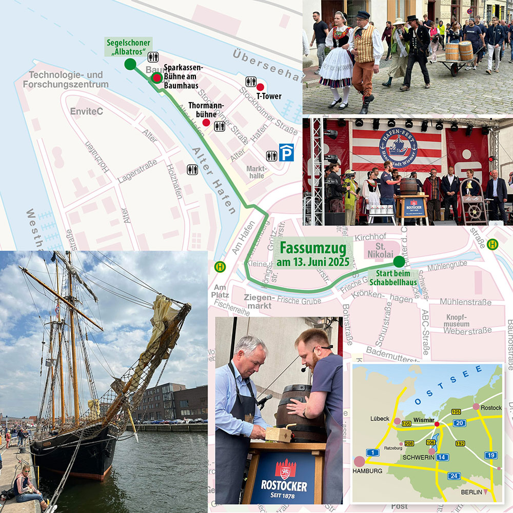 Am Freitag, dem 13. Juni 2025, geht es mit dem Fassumzug (s.u.), den Salutschüssen und der offiziellen Eröffnung durch den Bürgermeister Thomas Beyer los. Und nicht zu vergessen ist das Feuerwerk am Sonnabendabend (22.45 Uhr), das immer wieder die Menschen in den Hafen zieht.